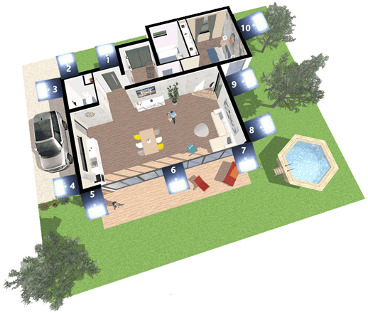 Az alábbi tervrajzon láthatod, hova és mennyi fényvetőt érdemes felszerelni egy átlagos méretű udvart figyelembe véve: